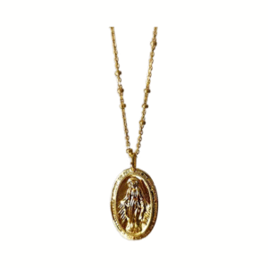 This stunning gold plated chain for women features a miraculous medal, perfect for creating chic stacked necklaces for women or wearing alone as a delicate statement piece.